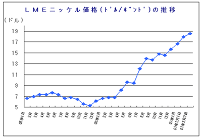 両LMEニッケル価格は、2005年平均の6.7ドル/ポンドから足元18ドル/ポンドへ急激に高騰、加えて諸資材も値上がり基調にあることから高合金製品の原材料コスト比率は60%から80%まで高まっています。