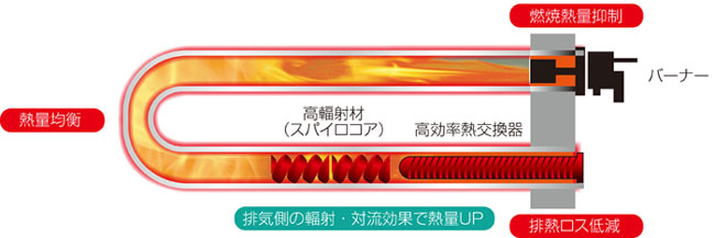 間接加熱に用いるラジアントチューブの排気側に取り付けた高効率熱交換器により、排ガス保有熱を効率的に燃焼空気に伝達し、トップクラスの省エネルギーを図ります。