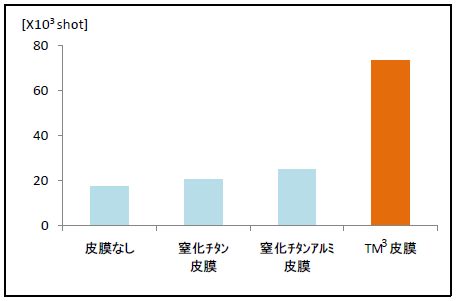 これらの特性から、東北特殊鋼(株)で実施した鍛造金型での寿命試験(図1)において、「STAR-TM3」皮膜を施した鍛造金型は従来の窒化チタン皮膜や窒化チタンアルミ皮膜を施した金型に比べ約3倍の寿命となる結果が得られています。