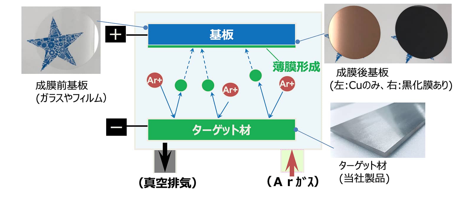 - 低反射率:銅(Cu)の導電膜の反射率を10~20%に抑制できる黒化膜を成膜可能
