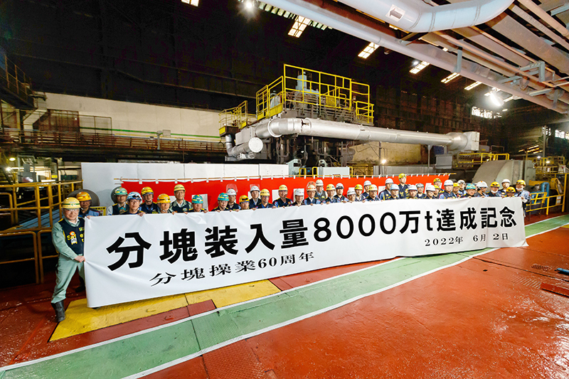 分塊圧延工場は、製鋼プロセスで製造した鋳片や鋼塊を再加熱し、当社の主力素材供給工場として主に半製品である鋼片と、直径70~310ミリメートルの分塊丸断面製品を製造している工場です。1962年の操業開始以降、1976年に分塊装入量累計1,000万トンを記録してからは6~7年ごとに1,000万トンのペースで生産を積み重ね、操業60周年を迎えた2022年に8,000万トンを達成しました。