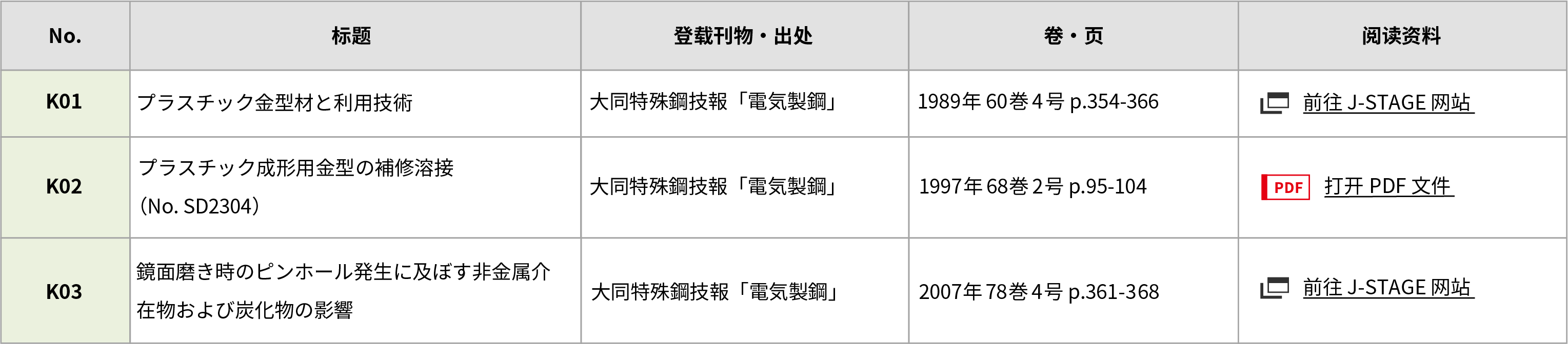| K01 | プラスチック金型材と利用技術 | 大同特殊鋼技報「電気製鋼」 | 1989年 60巻 4号 p.354-366 | 前往 J-STAGE 网站 |