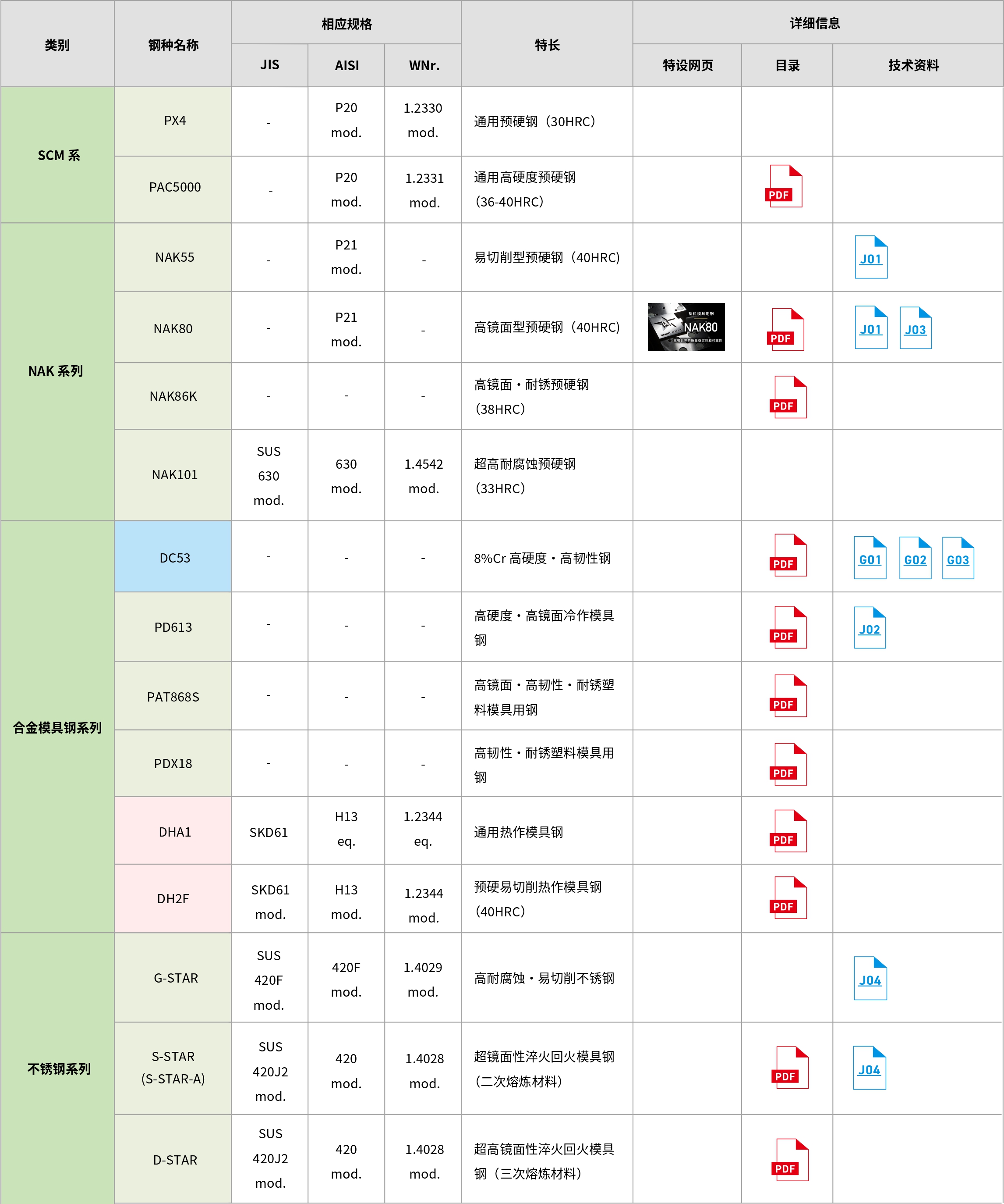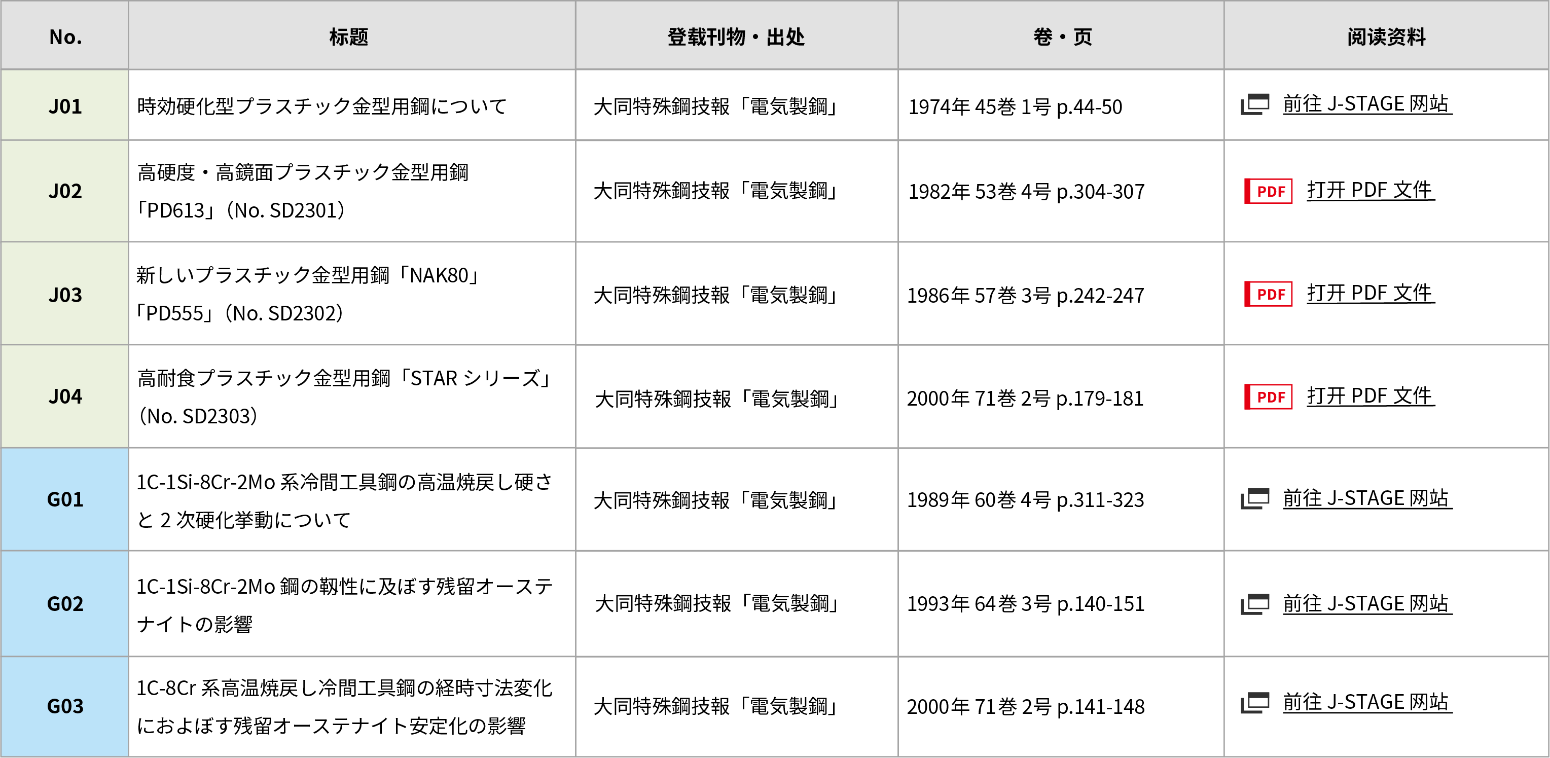 | J01 | 時効硬化型プラスチック金型用鋼について | 大同特殊鋼技報「電気製鋼」 | 1974年 45巻 1号 p.44-50 | 前往 J-STAGE 网站 |