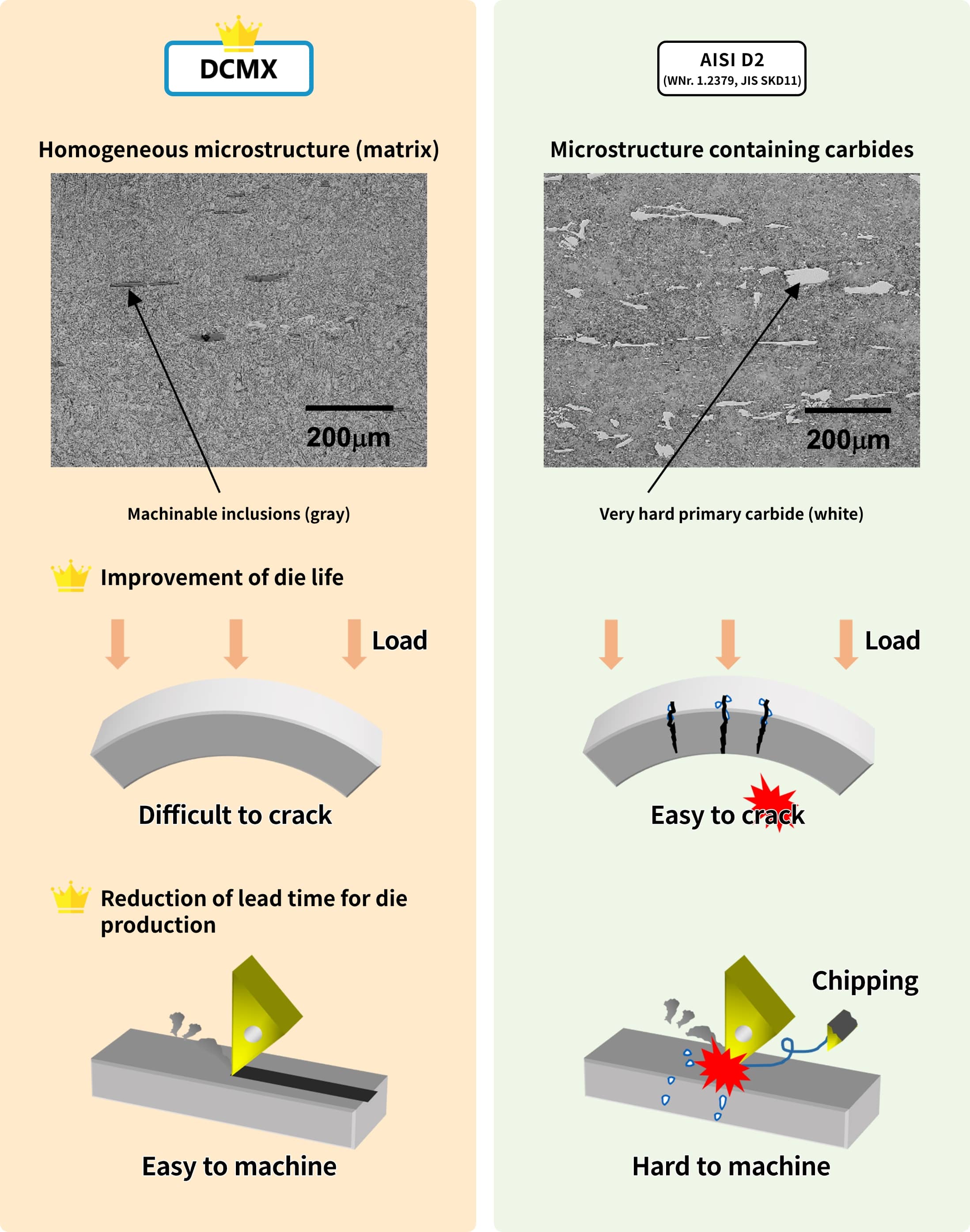 DCMX is the first matrix type cold work die steel in Japan, which was marketed in October 2008. Excellent isotropy has been achieved by reducing coarse carbides to the extreme limit. Easy dimension adjustment during heat treatment contributes to shortening the lead time for making dies for cold pressing and cold forging.In addition, high toughness is expected to improve die life. Furthermore, it has high hardness and excellent machinability, that is it has ease of making dies and high performance at the same time.