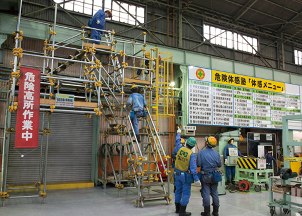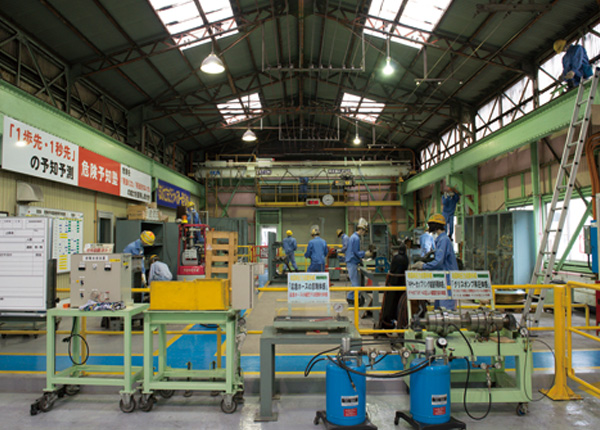 ものづくりに携わる企業にとって「職場の安全維持」は、何よりも重要なこと。当社は「安全と健康は幸せの原点」「安全無くして生産なし」「安全を全てに優先する」を基本理念に、社員の安全確保に全力を注いでいます。当社は安全教育の場として、「危険体感塾」を開講。また、危険を見抜く力を養うために「危険予知塾」を開き、安全に関する感性の向上に努めています。
