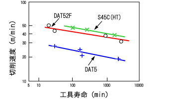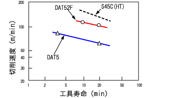 - チタン合金に比べて被削性が優れています。ドリル加工においてはベース材に比べて50%~70%の加工率の向上が期待されます。超硬工具による旋削加工では20%~30%の向上が期待されます。