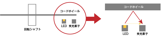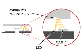 - LEDからの光は、反射パターンが刻まれたコードホイールで反射し、その反射パターンを受光素子で検知。