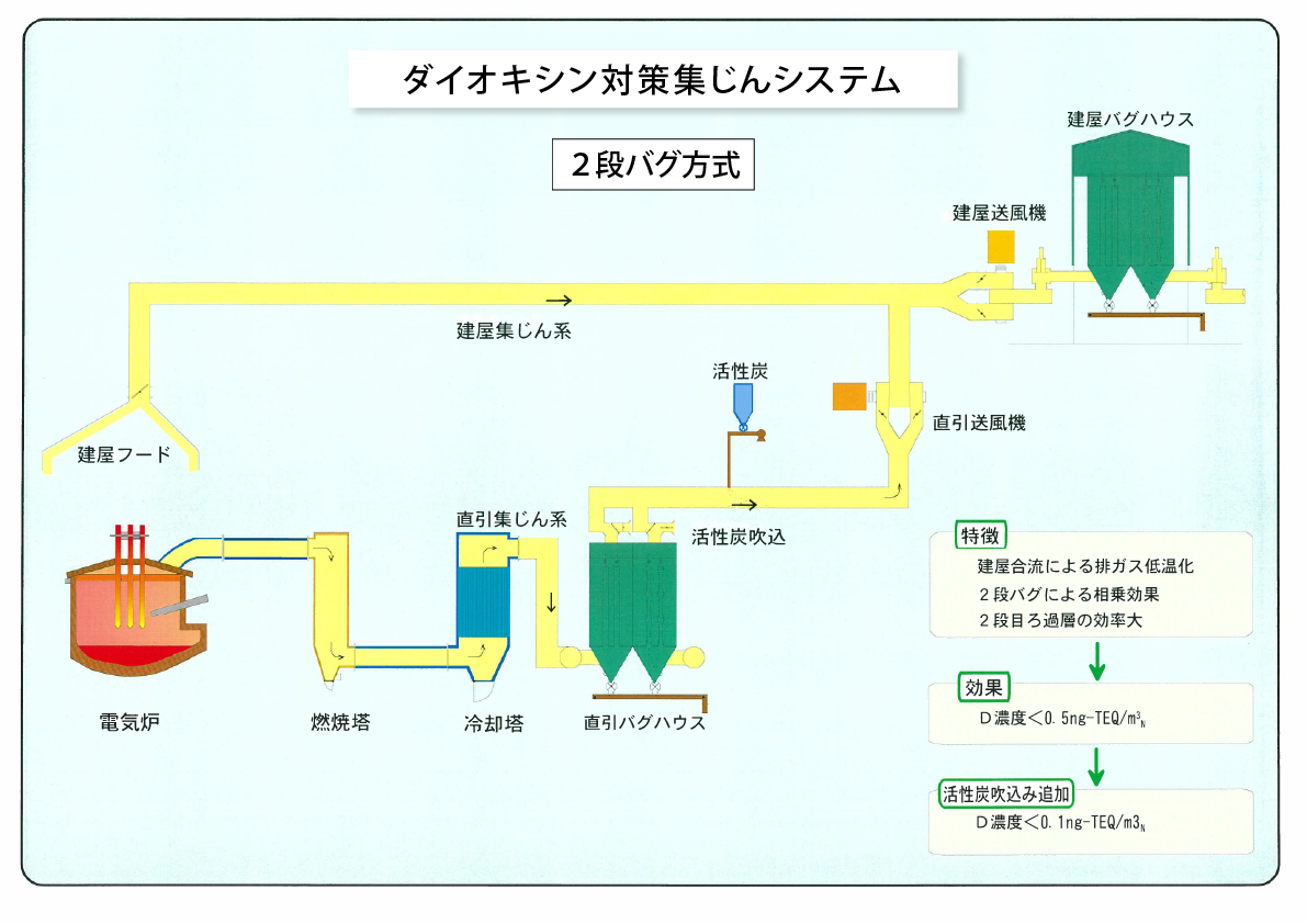 製鋼用電気炉からの排ガスを処理する「直引集じん設備」と建屋からの場内ガスを処理する「建屋集じん設備」を組み合わせた独自の「ダイオキシン対策集じんシステム(2段バグ方式)」と、排ガスの急速冷却、低温ろ過制御を組み合わせることで、発生ダイオキシン類の99%以上を除去することができます。