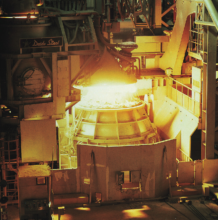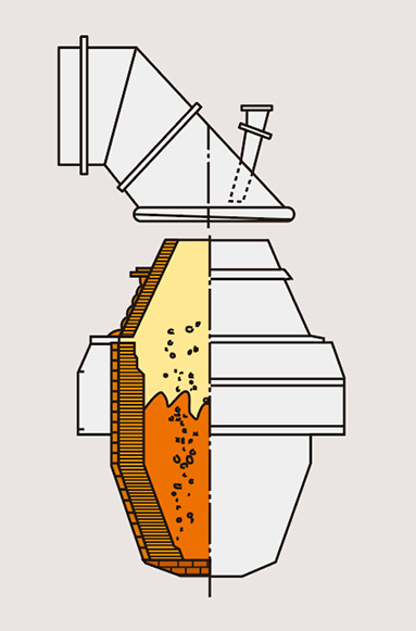 ステンレス鋼等、クロムを含有する鋼の溶製において、炉体下部に設けた複数本の二重構造の羽口から、酸素とアルゴン(または窒素)の混合ガスを直接溶鋼に吹込み、発生するCOガスの分圧を下げて優先的に脱炭する装置です。
