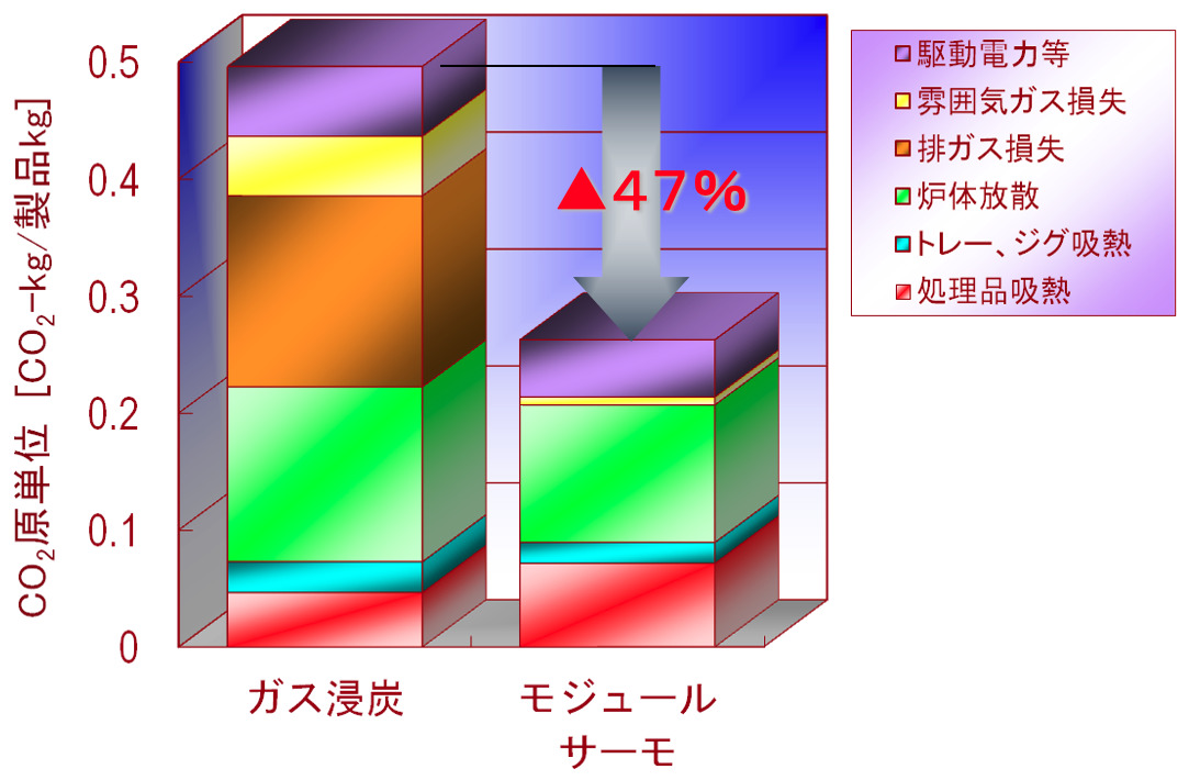ガス浸炭炉に比べCO2排出量 47%削減、処理製品重量あたり39%の省エネと要員一人あたり3倍の生産量増加が得られ、立ち上げ時間・立ち下げ時間の短縮、保全周期も延長と大きな効果を発揮します。(資源エネルギー庁長官賞を受賞)