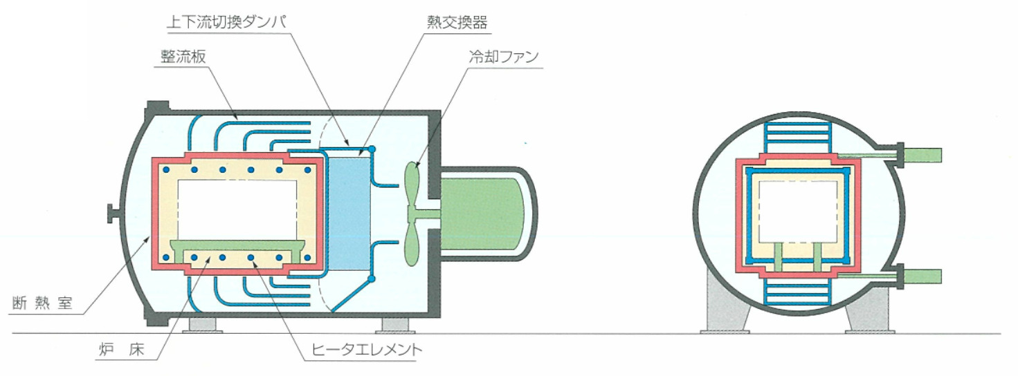 合理的なガス整流板と、ガス流切換ダンパによる冷却ガスの上下切換えにより、小物から大形品まで均一冷却が可能です。