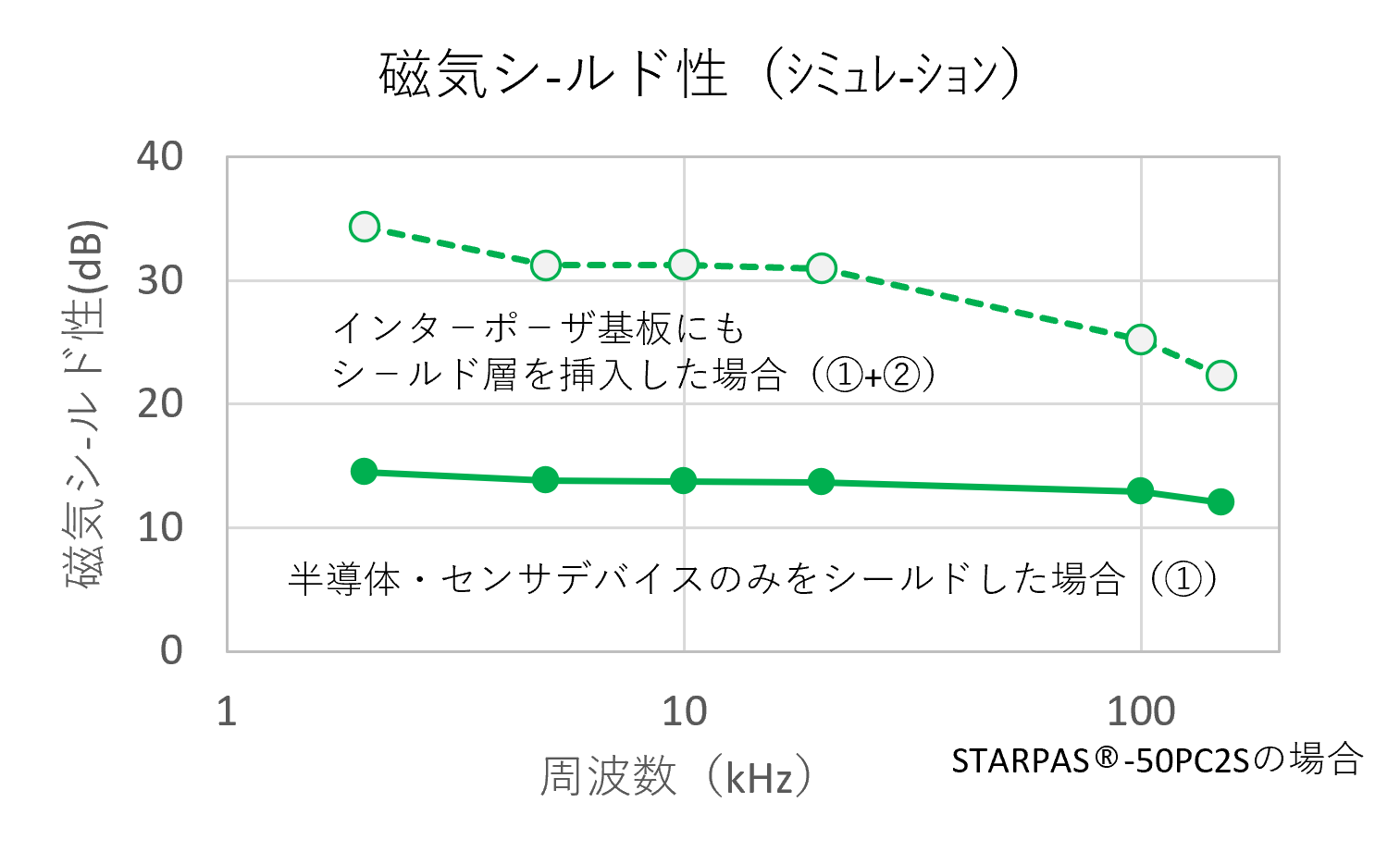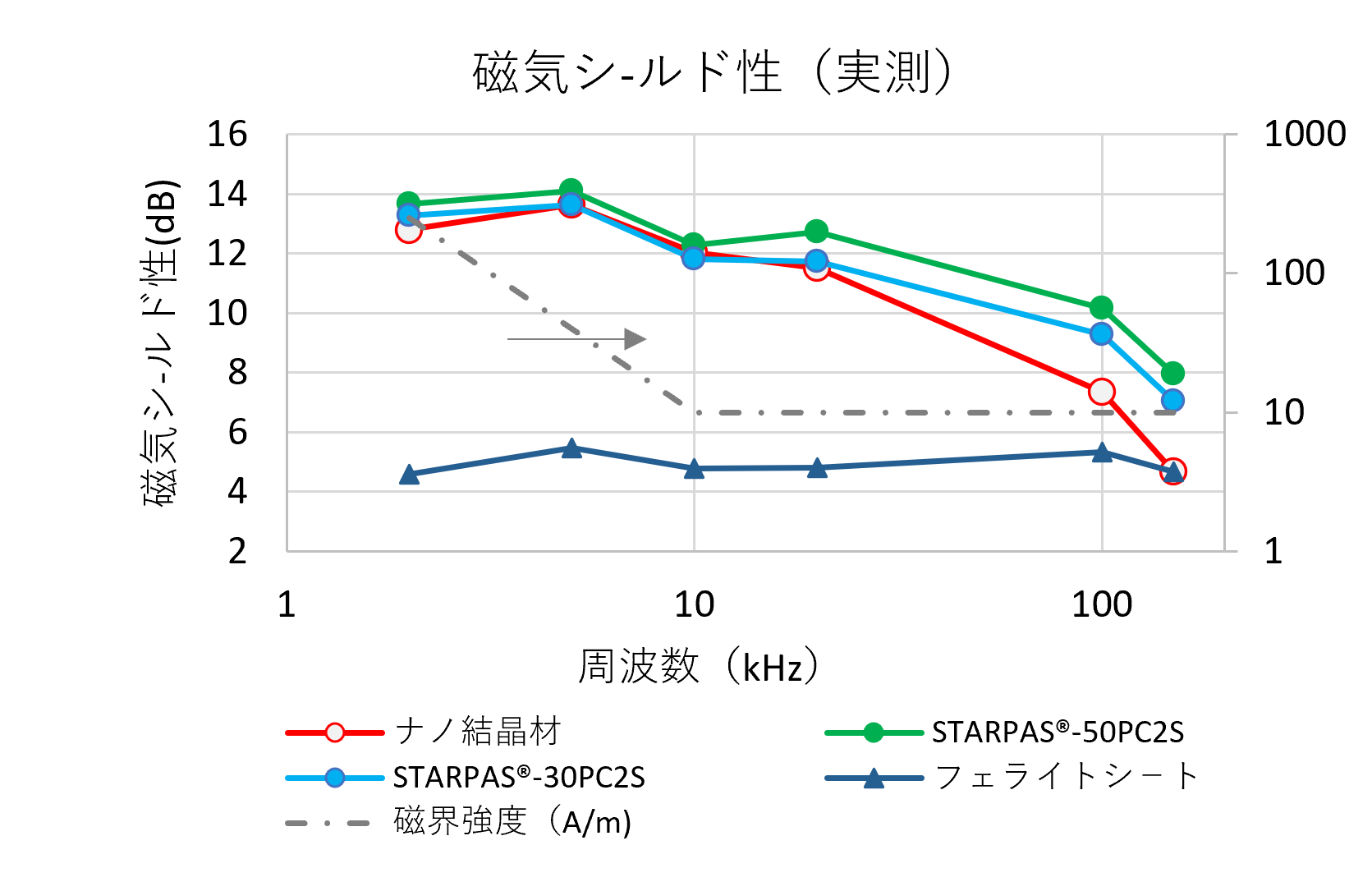 STARPAS®-PC2Sは、弱磁界で高いシールド性を示します。また、STARPAS®-DF42Nは、強磁界でもシールド性を維持します。