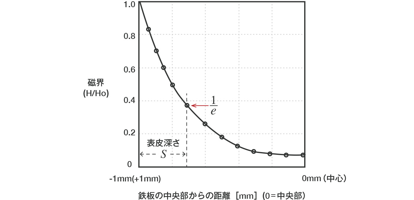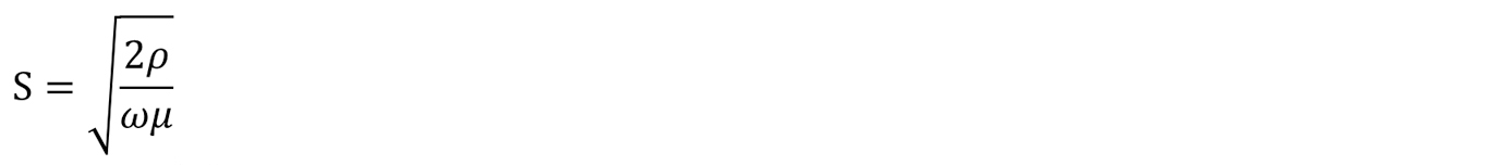 表皮深さとは、ある物質に入射した電磁界が1/e (≒ 1/2.718 )に減衰する距離である。表皮深さSは以下の式で表される。