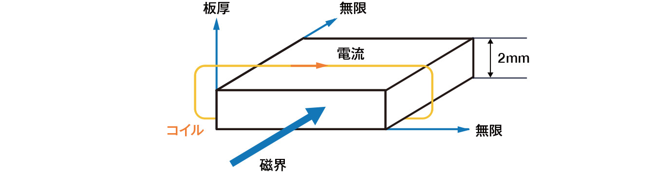 例えば、図1の鉄の板(断面の厚さt=2[mm]、複素比透磁率μr=300、比抵抗ρ=10-7[Ωm])に、周波数f=1[kHz]の磁界を印加した場合、鉄中の磁界分布は図2となる。