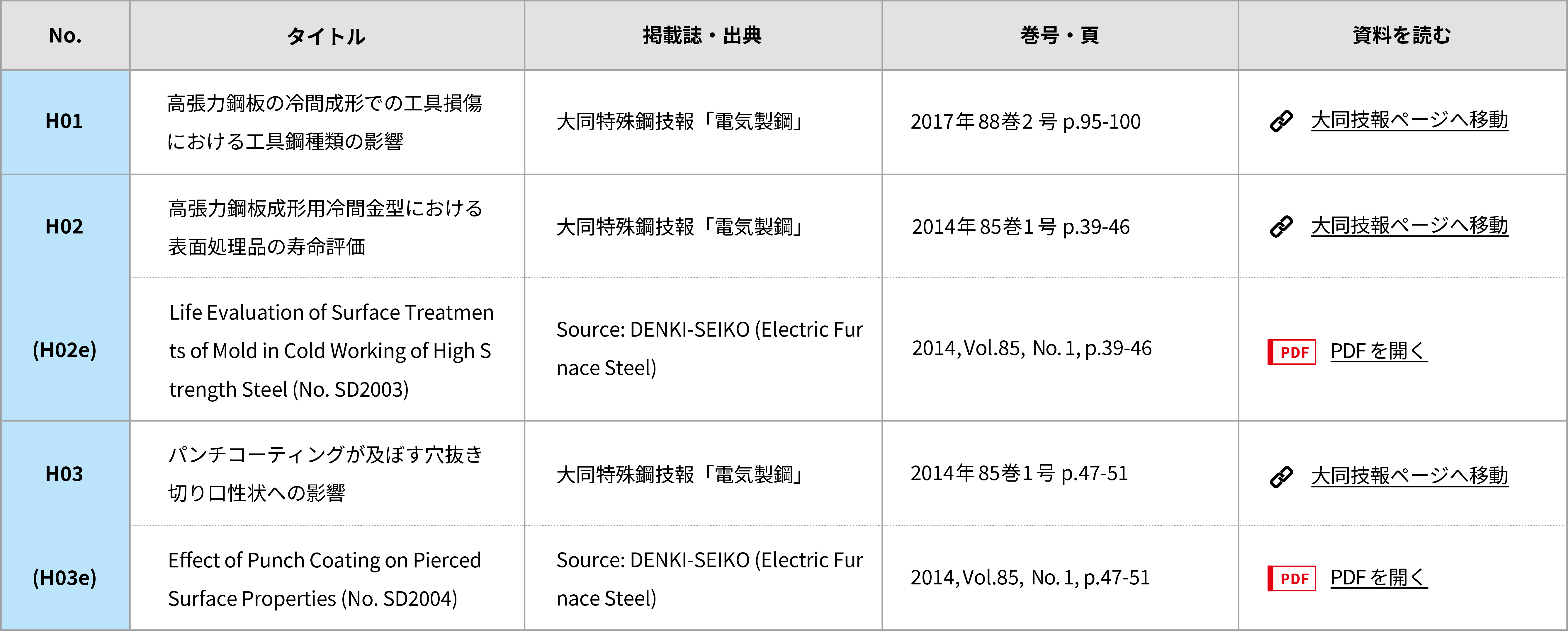 H02 高張力鋼板成形用冷間金型における表面処理品の寿命評価 大同特殊鋼技報「電気製鋼」 2014年 85巻 1号 p.39-46 大同技報ページへ移動