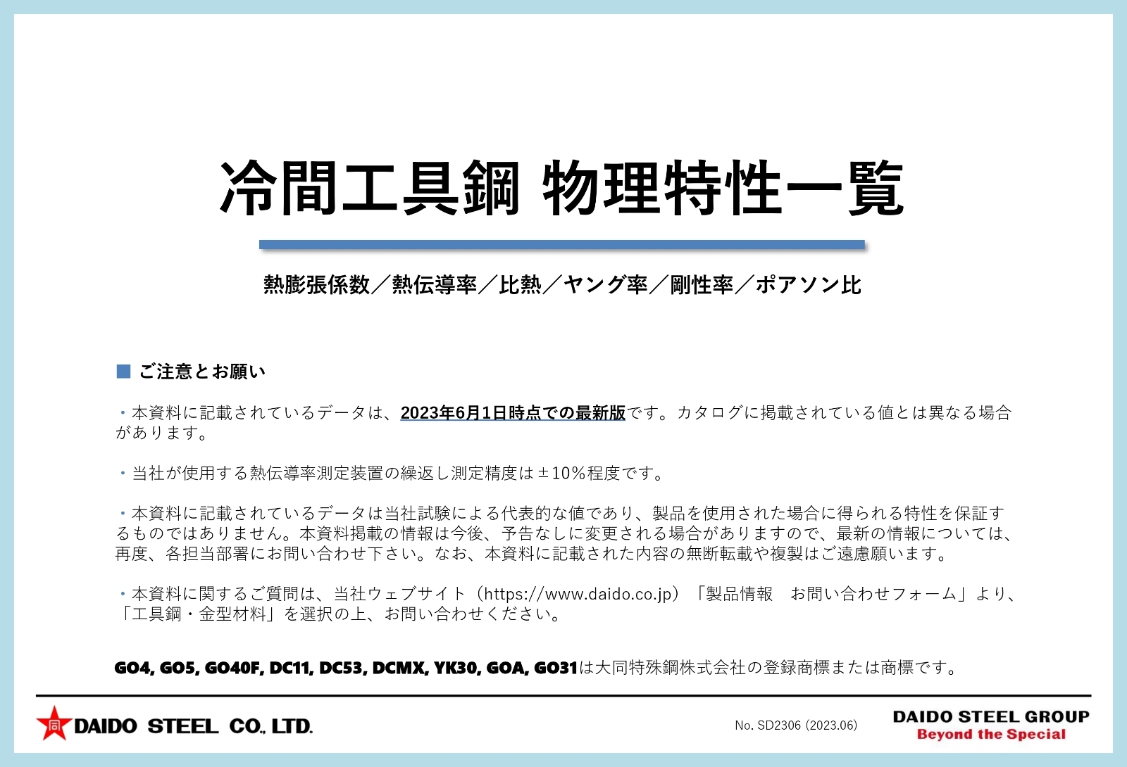 最新の物理特性データは「物理特性一覧」をご覧ください。 カタログに掲載されている値とは異なる場合があります。