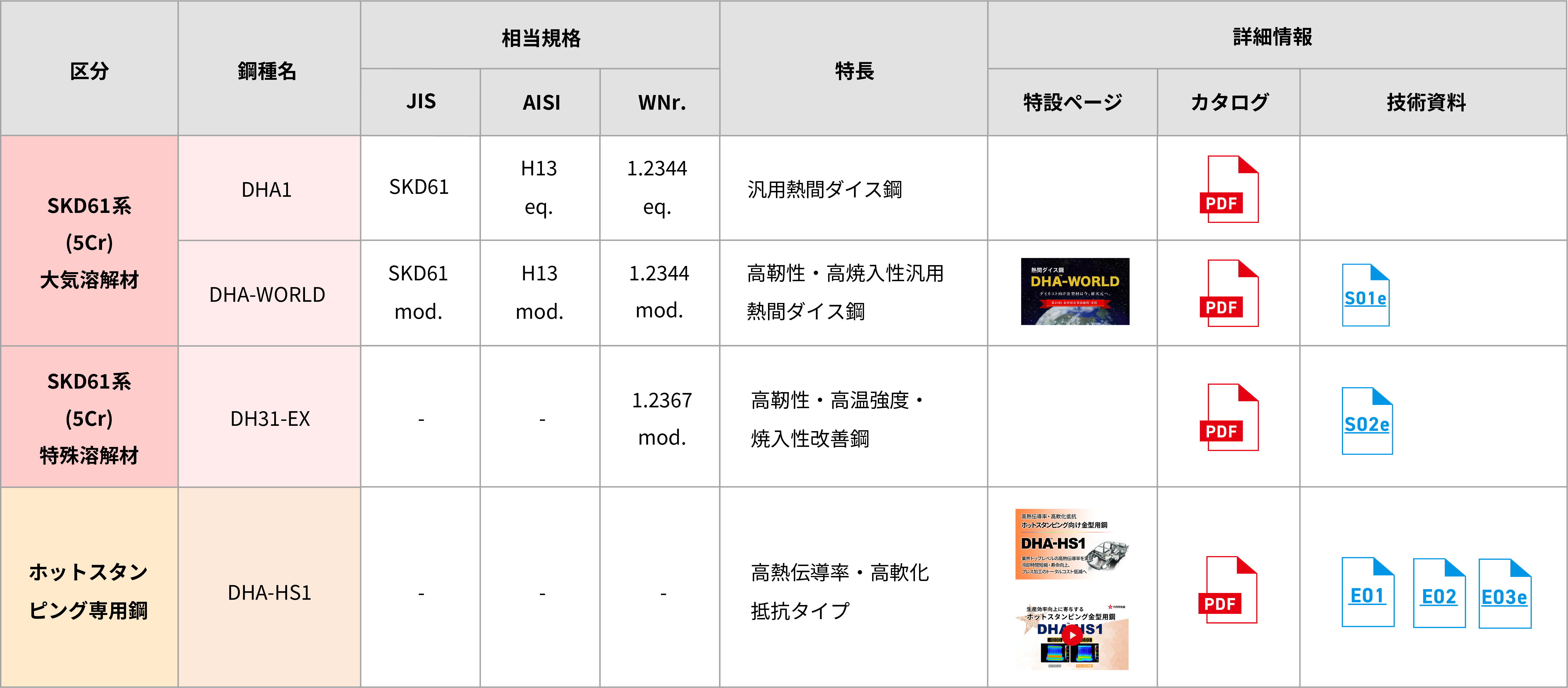 | 区分 | 鋼種名 | 相当規格 | 特長 | 詳細情報 | ||||