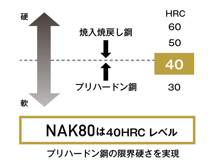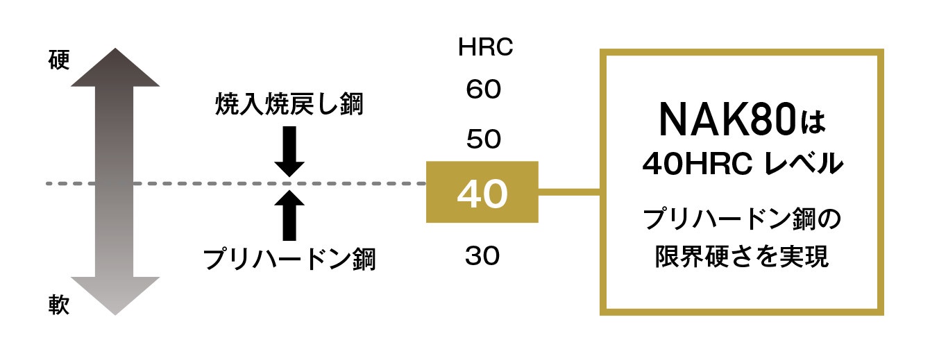 プリハードン鋼の限界硬さと削りやすさを絶妙なバランスで両立させています。
