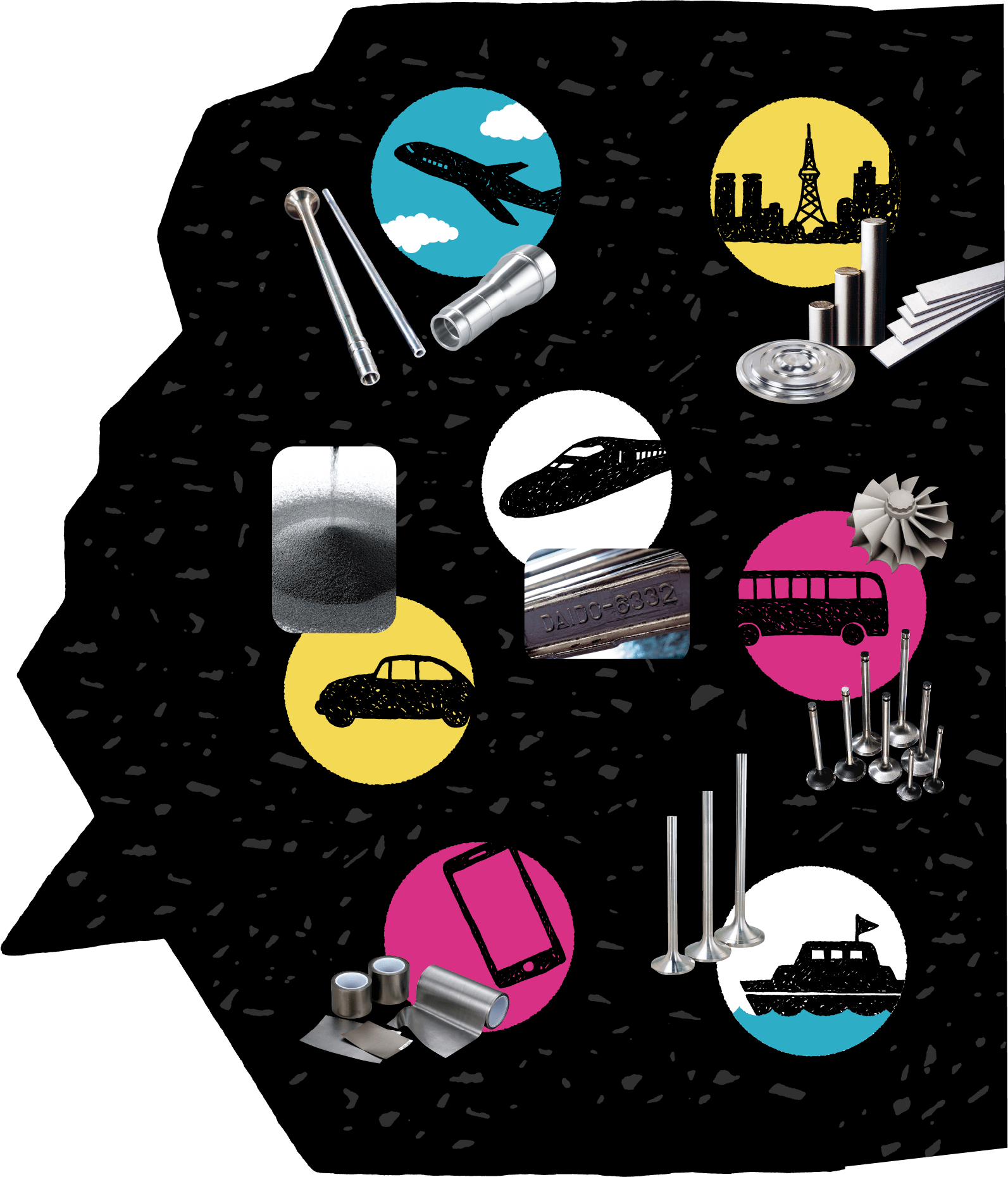 大同特殊鋼がつくる製品は、クルマをはじめ、航空機、鉄道、船舶、精密機器などをつくる際に用いられます。つまり、現代社会を成り立たせるために大同の特殊鋼は不可欠なのです。